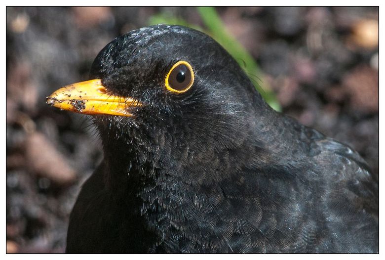 Zijn snavel en oogringen zijn geeloranje en vormen zo een sterk licht-donker contrast met het zwart van de veren. Hoe beter zijn conditie door goede voeding hoe duidelijker oranje!