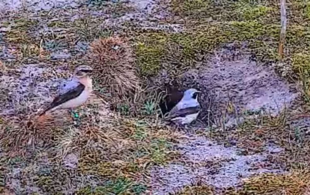 Tja, toen begonnen we te denken aan afwijkingen. Is het een hybride, een kruising tussen twee tapuitsoorten? Dat lijkt overigens onwaarschijnlijk, omdat er maar één soort voorkomt in Nederland en deze vogel geen afwijkende kleur voor een tapuit laat zien. Is het dan een jonge tapuitman van vorig jaar, nog niet volledig op kleur, die er niet in is geslaagd om een nestje voor zichzelf te starten. Misschien heeft ‘ie de echte V weggejaagd en helpt nu zelf enthousiast mee met de opvoeding. Of… is het (nu volgt een moeilijk woord): gynandromorfisme, een aanpassing in de hormoonhuishouding, waarbij een vrouwtjesvogel kleedkenmerken krijgt van een mannetje. Tja, of is het toch wel gewoon een vrouwtje en krijgt ze in het broedkleed wat meer nadrukkelijke kenmerken?