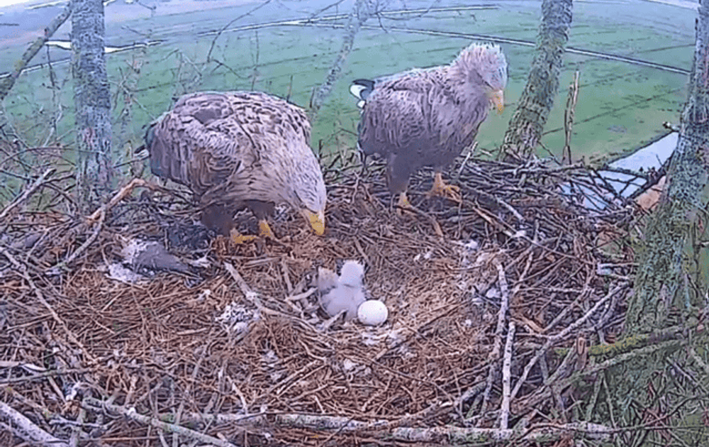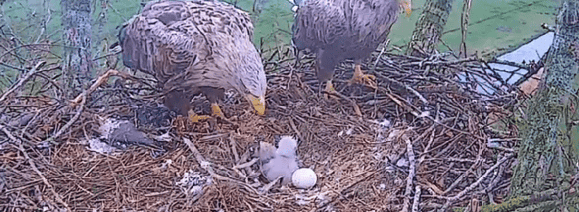 Regelmatig kijk ik op de webcam en zie ik onze jonge zeearenden languit op het nest liggen. Het lijkt soms alsof ze dood zijn. Niets is minder waar. Eigenlijk doen ze maar 3 dingen: eten, slapen en oefenen.