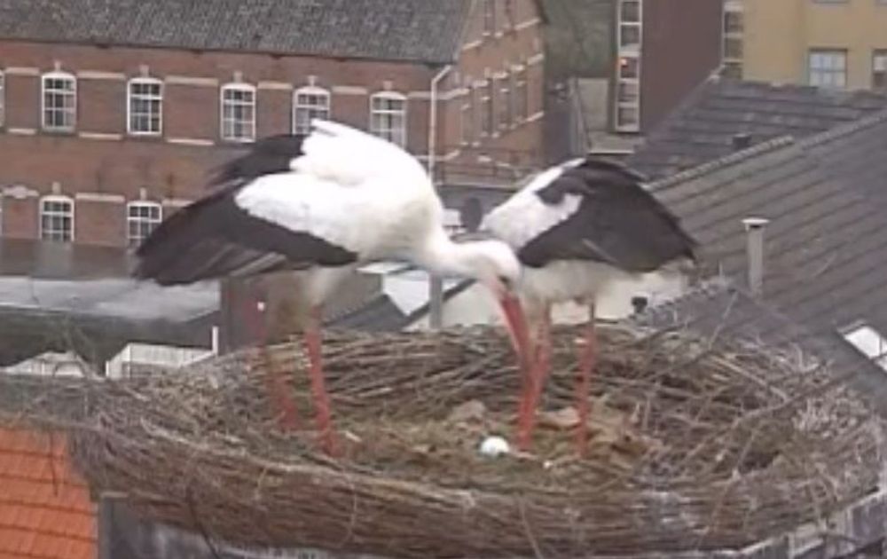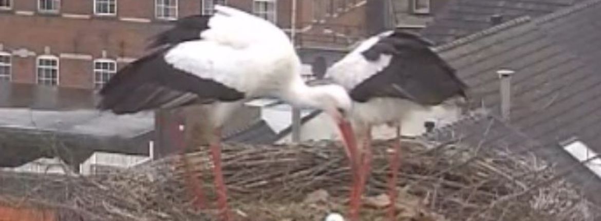 Ooievaars gaan niet direct broeden. Ze wachten daarmee tot het tweede ei er is. De eieren worden om de dag gelegd, dus morgen(avond) kunnen we iedere keer als het vrouwtje opstaat hoopvol in het nest gluren.