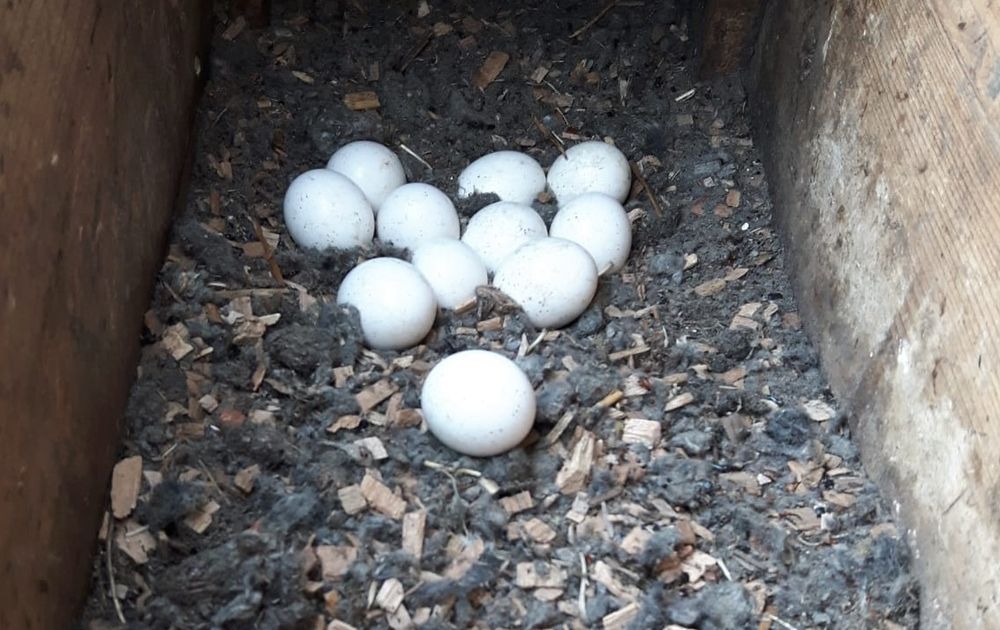 Ik geloofde mijn ogen niet toen ik gisteren aan het begin van de avond een appje kreeg van Anita van Dooren, samen met Christien Hermsen een bijzonder actief steenuilendamesdubbel. Sinds 2007 zijn beide dames onder de naam 'Uilenvrouwkes' actief in de omgeving van Oisterwijk in Brabant waar ze jaarlijks vele tientallen nestkasten controleren. Op het appje telde ik 11 eieren. Ik wreef mijn ogen nog eens een uit, maar het waren er echt 11. Een onwerkelijk hoog aantal. Anita schreef erbij dat ze zelf ook van verbazing achteroversloegen toen ze aan het tellen kwamen. In de kast bevonden zich echter 3 uilen, 2 vrouwtjes en 1 mannetje. De eieren zijn waarschijnlijk van beide dames afkomstig. Hoe kansrijk zo'n nest is, is de vraag. De dames (Anita en Christien bedoel ik) blijven het echter nauwgezet volgen. Een nest met 11 jongen op uitvliegleeftijd zou wereldnieuws zijn. Voor de man in kwestie breken zware tijden aan. Ik geef het je te doen: 2 dames en 11 koters onderhouden; 13 hongerige magen te voeden. Brabantse nachten nachten moeten wel lang zijn. Je zou medelijden met hem krijgen.