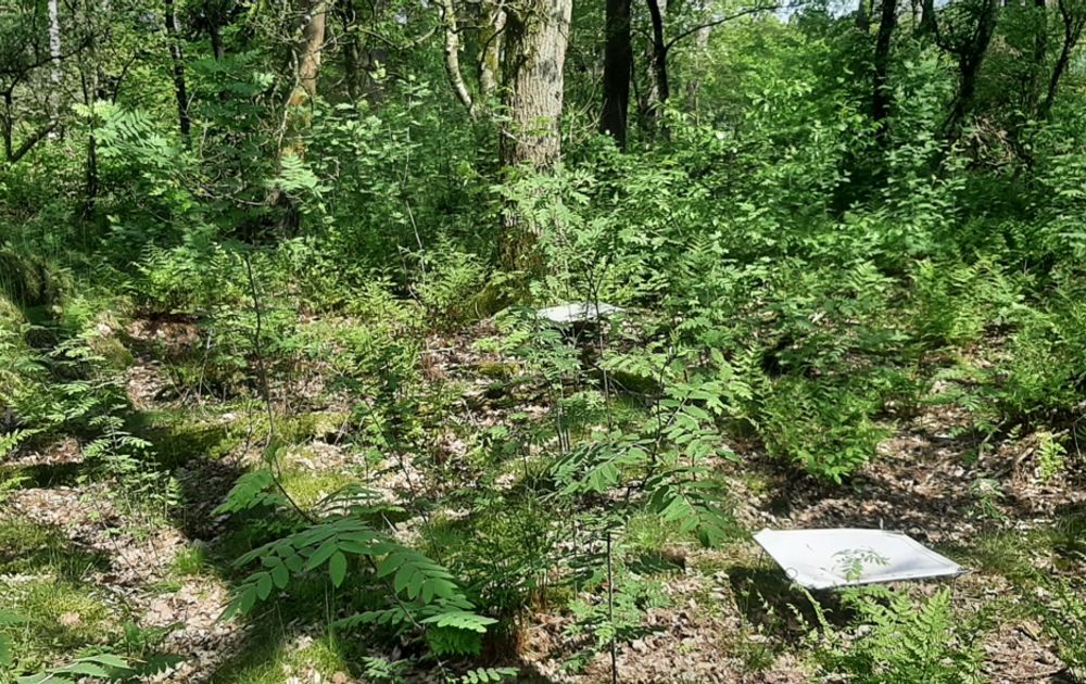 Die keutels verzamelen we door netten onder een eik te zetten (zie de bovenste foto), eentje dicht bij de stam en eentje meer aan het uiteinde van een grote tak. Twee keer per week verzamelen we de keutels, die eruit zien als kleine zwarte korreltjes (zie de onderste foto). Met een kwast vegen we alle materiaal in het net netjes naar het midden, waarna we de grootste takjes en blaadjes verwijderen. Je houdt dan de keutels en wat restmateriaal over. Dat gaat in een klein papieren enveloppe, waarop de locatie, de datum van verzamelen en de code van de boom en het net komt te staan.