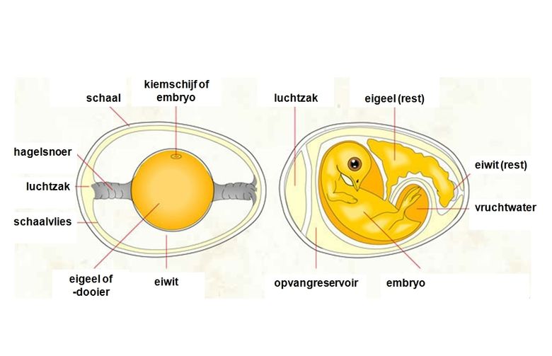 eiwit = bescherming van de eidooier, extra voedsel met veel proteïnen en juist weinig vet.