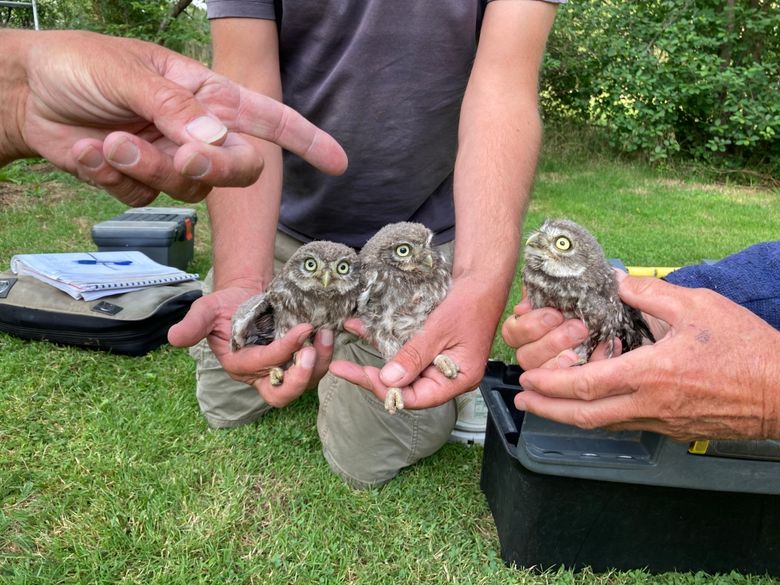 Toen we op 30 april ons eerste bezoek brachten, troffen we behalve 3 bebroede eieren dan ook 2 volwassen uilen. De  nieuwe dame was geringd - 3.849.502 - en bleek tot onze verrassing geboren in de Beleef de Lentekast, 961 meter verderop. De schreeuwlelijk was ongeringd, maar gaat vanaf dat moment als 3.849.778 door het leven. Op 16 mei zat het vrouwtje nog steeds te broeden, maar op 22 mei was het zover: 3 jongen, ongeveer 4 dagen oud. Teruggerekend moet het eerste ei rond 20 april zijn gelegd. Op 5 juni zijn de jongen geringd. Het waren geen vetzakken. Met een conditie-index van 0.89, 0.82 en 0.90 zaten ze alle 3 iets onder hun streefgewicht. Pa en ma kregen het advies iets beter hun best te doen.