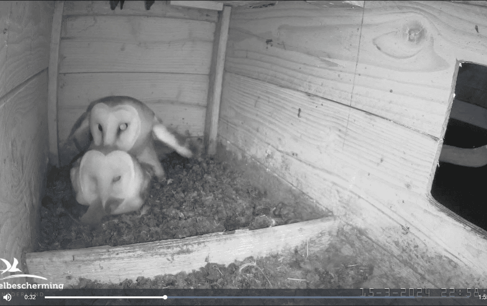 Vorig jaar was de eerste prooioverdracht op 13 maart en het eerste ei op 29 maart; een interval van 16 dagen. Dit jaar was de eerste prooioverdracht op 11 maart. Als we hetzelfde interval aanhouden, zou het eerste ei dus rond 27 maart kunnen verschijnen. Zelf denk ik dat het toch wat later dan dat gaat worden omdat de muizenaantallen dit jaar lager lijken te liggen. Maar ja, wat weet ik… Ik heb de poll nog nooit gewonnen, dus misschien kun je beter maar niet naar me luisteren. Uiteindelijk is er maar één iemand die ons uit ons ongeduld kan verlossen, en dat is vrouw kerkuil.