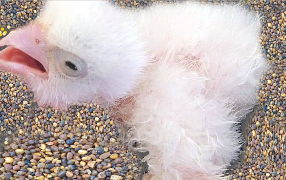 Het is nog nat en roze, en vrouw slechtvalk houdt het onder zich. Binnen enkele uren is het kuiken droog en in witte dons gehuld. Het weegt 35 tot 40 gram.