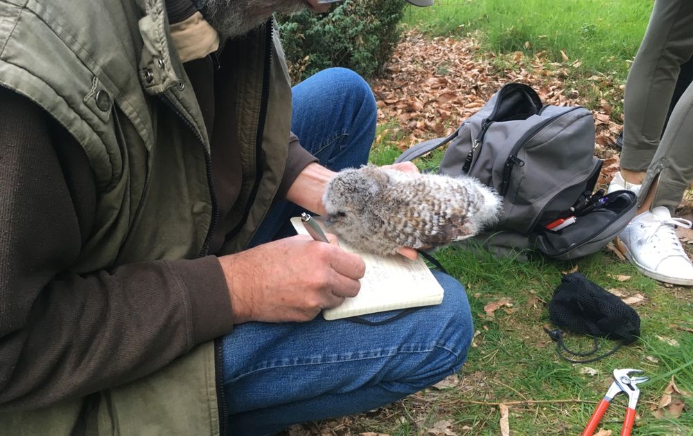 Wat een prachtige bosuil is de vrouw! Haar ringnummer is NLA 6.191.46X. De X is eigenlijk ook een cijfer, maar het is gebruikelijk om niet het hele ringnummer te vermelden om valse terugmeldingen te voorkomen. Dankzij haar ringnummer weten we nu dat het niet om dezelfde vrouw als voorgaande jaren gaat. Het gaat echter wel om een bekende vrouw, want deze vrouw is in 2016 als jong geringd op het plateau van de Meinweg. Dat is zo’n 4 tot 5 kilometer van onze kast af. Na het wegen en het opmeten van de vleugel kon worden geconcludeerd dat deze vrouw in goede conditie is.