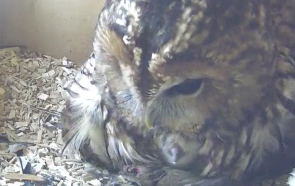 Het kan ook zijn dat het eerste ei in de eerste paar dagen na het leggen te weinig bebroed is. Vrouw bosuil was in het begin van het broeden regelmatig op pad.