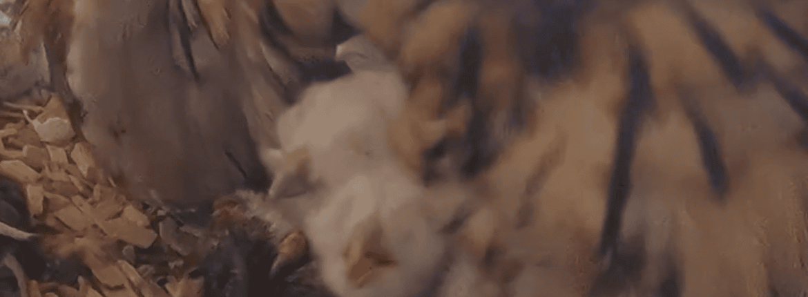 Maar dat is wel waar het zich nu eerst voornamelijk afspeelt. De kuikens zitten veilig onder het verenkleed van moeders. Als de kuikens straks iets groter zijn en moeders ook een keer buiten de kast in de rust gaat, kun je aan het rommelige verenkleed zien dat het om een broedend vrouwtje graat.