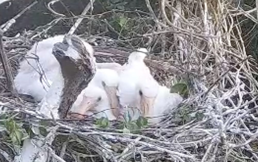 Inmiddels zijn we dankzij een onverwacht nakomertje tot maar liefst elf lepelaarkuikens gekomen! Je kunt nu prachtig vergelijken in hoe korte tijd de kuikens groeien. Op het voorste berkcamnest kuikens van maximaal negen dagen oud die niet of nauwelijks op hun poten kunnen staan. In het nestcamnest kuikens die balancerend op de rand fanatiek hun vleugeloefeningen uitvoeren.