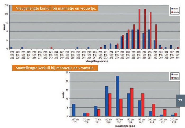Nou dat valt bij kerkuilen nog wel mee. Bij sommige andere soorten kan het vrouwtje tot wel 2x zo groot en zwaar zijn als het mannetje, maar bij kerkuilen hebben we het over 5-10% verschil. Er is ook nog best een grote overlap tussen de twee, waardoor grote mannetjes nog steeds groter zijn dan kleine vrouwtjes, maar gemiddeld gezien zijn de vrouwen groter en meestal ook zwaarder. Zie ook de grafieken hierboven, als voorbeeld.
