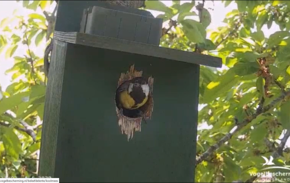 Want onze koolmeesmoeder is er maar druk mee. Net als man koolmees voert ze regelmatig en brengt ze ‘luiers’ mee naar buiten. Maar ze heeft ook nog wat aanvullende taken die alleen zíj uitvoert. Bijvoorbeeld het warm houden van de kuikens. De eerste dagen kunnen de kuikens hun eigen temperatuur nog niet op peil houden en zijn ze dus volledig afhankelijk van de moeder voor warmte. Nu de kuikens al wat groter worden zullen ze echter steeds beter zelf warm kunnen blijven. We zullen vrouw koolmees dan ook steeds minder vaak op de kuikens zien zitten.