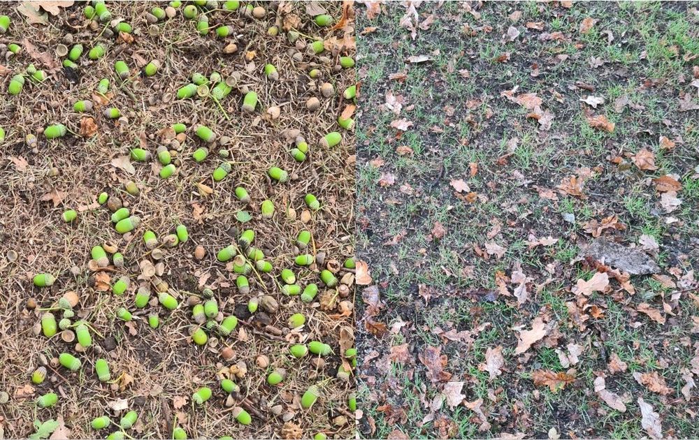 Maar nu naar 2022. In de foto in de header zie je links de eikelproductie van een prachtige vrijstaande eik bij mij in de buurt in het najaar 2020 en rechts dezelfde plek in 2021. Het verschil behoeft geen toeliching. Van bosmuizen is bekend dat de aantallen meebewegen met het aantal eikels (en andere nootje als die van de beuk en hazelaar). Als de eikeloogst (met een bosbouwterm mast genoemd) van 'mijn' eik representatief is voor de oogst aan eikels, beuken- en hazelnoten in het afgelopen najaar, dan ziet het er slecht uit voor de bosmuis. En daarmee voor de dieren waarbij de bosmuis een prominente plek op het menu inneemt. En dus voor steenuilen.