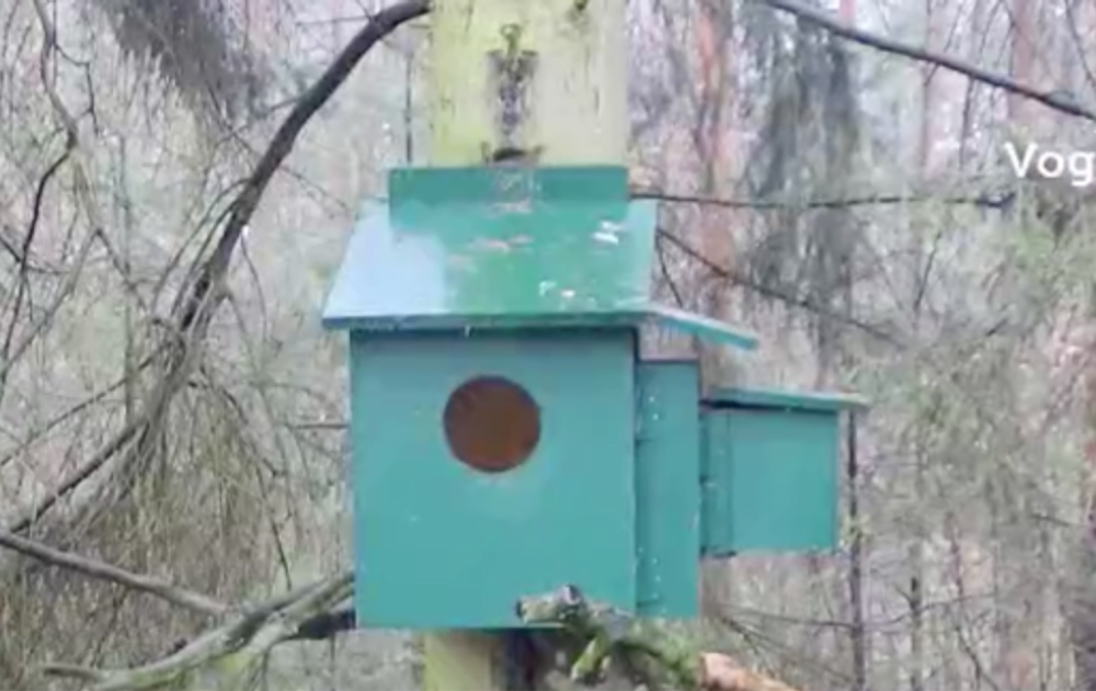 Met dit regenachtige en winderige weer blijf ik ook liever binnen! Ik denk dat mevrouw bosuil blij is dat zij een nestkast heeft en niet zoals haar man moet schuilen. De camera en nestkast zwiepen wel wat heen en weer in de wind, maar gelukkig zijn beide stevig bevestigd.