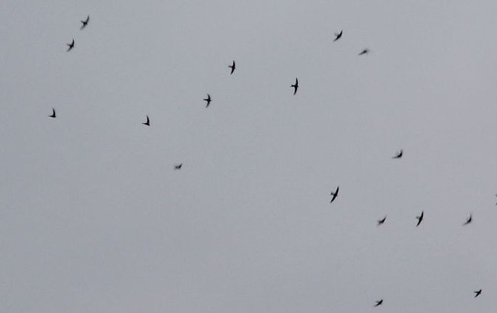 De jongen die zijn uitgevlogen komen in een heel andere wereld terecht. Alle drie de jongen vlogen in de avond uit. Ze hebben ongetwijfeld hoog in de lucht samen met een grote groep soortgenoten overnacht. In de tijd van het jaar dat de jongen uitvliegen zijn er grote groepen niet-broedende gierzwaluwen in de lucht. Deze vogels hebben geen nestplaats en overnachten hoog in de lucht, maar overdag zijn ze vaak rond nestlocaties te vinden. Daar zorgen ze voor veel onrust wat we ook bij ons paartje de laatste dagen nog konden zien. Ze verdedigen hun nestplaats met gezamenlijk roepen en ook buiten hebben ze zich ongetwijfeld gemengd in groepen die rond het kasteel vliegen om een oogje in het zeil te houden.