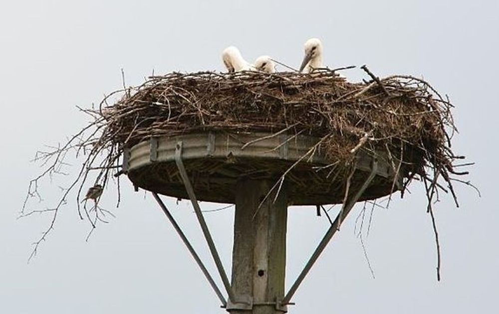 Ooievaarsnesten zijn ook in trek bij nijlganzen, ze krijgen het soms zelfs voor elkaar om de ooievaars te verdrijven. De nijlgans broedt vaak in bomen, graag in grote nesten van andere vogels, in de vork van boomstammen of tussen dichte vegetatie. Het nest wordt gemaakt met takken en twijgen,  zo'n kant-en-klaar nest op een paal is daarom zeer aantrekkelijk. Zo hoog boven de grond is voor de jonge gansjes geen enkel probleem, ze duikelen als ééndagskuiken naar beneden zonder iets te breken.