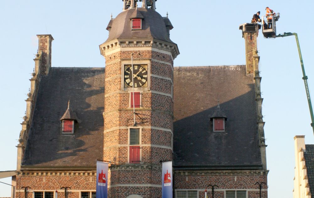 Op het inmiddels 400 jaar oude stadhuis in Gennep zit het ooievaarsnest op ong. 20 meter hoogte. Om iedereen een idee te geven van de locatie en de omgeving, geef ik in dit blog wat tekst en uitleg. Op de foto hierboven het prachtig onderhouden stadhuis. Deze foto is in januari gemaakt tijdens het opknappen van het nest. Dit jaar zijn er nog volop feesten i.v.m. het 400 jarig bestaan. Onder meer een historisch weekend op 1 en 2 juli met een historische markt, oude ambachten, muziek en diverse Oudhollandse spelen.