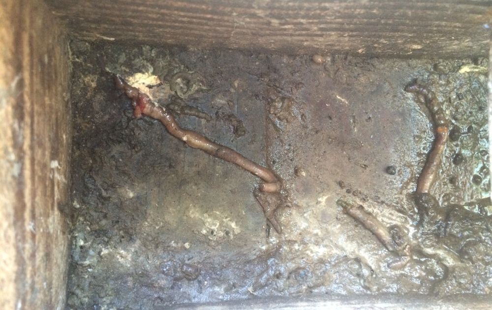 Een mailtje naar Arnold van den Burg - ei-expert en verbonden aan de Stichting BioSFeer - bevestigt dit. Het watergehalte is in regenwormen (en ook in vlinderrupsen) hoger dan in steenuilen. Als er veel regenwormen aangevoerd worden, wordt het overtollige water via de urine afgescheiden. Deze bevat dan relatief veel water. De ammoniak komt weer vrij als bacteriën het urinezuur afbreken. Ze kunnen dit alleen in vochtige omstandigheden. Als er dan ook nog eens sprake is van een kleine kast met weinig ventilatie ontstaat al gauw een wat de Duitsers zo treffend een ‘Kloakenmilieu’ noemen, vrij vertaald een rioolput. In goed Nederlands zou je het ook een mestkast kunnen noemen.