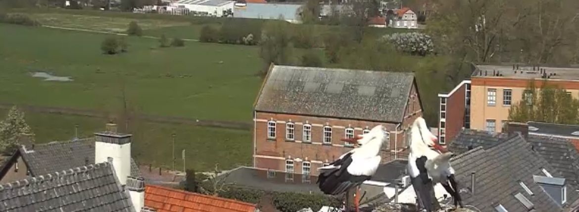 Dit jaar lijkt de vrede getekend tussen deze buren, maar is er af en toe een nieuwe kaper op de kust. Met als gevolg laag vliegende ooievaars en veel geklepper en gedreig. Maar onze ‘eigenaren’ weten stand te houden en broeden rustig verder.