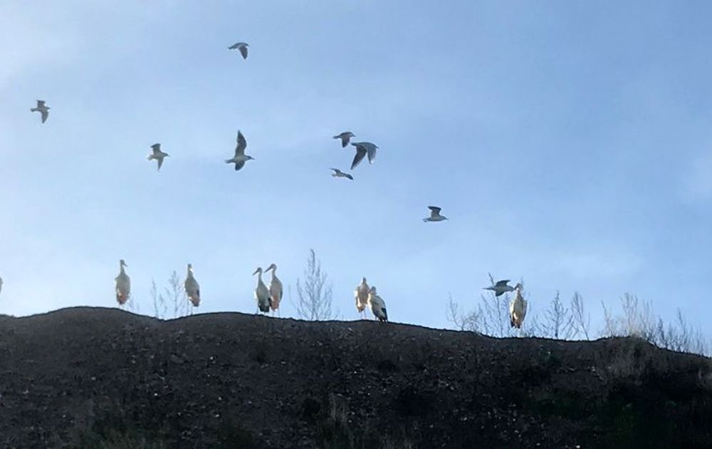 In koude winters trekken ooievaars nogal eens naar een vuilstort in de buurt. Zoals op de foto helemaal bovenaan het rijtje ooievaars bij een vuilstort in Oss tijdens de wintertelling. Op zulke plekken is vanalles van hun gading te vinden, al zijn het maar de muizen die daar rondscharrelen.