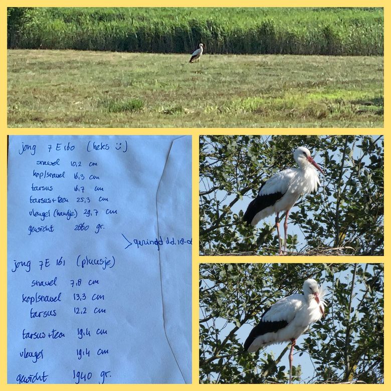 Dit jong is samen met brusje 7E161 op 18 juni 2022 door Annemieke en Wim geringd. Dat liet ‘ze’ niet zonder slag of stoot over zich heen komen. Ze kwam bijna overeind toen Wim bij de nestrand verscheen. En ook op de grond tijdens het ringen pikte ze even met de snavel naar Annemieke, wat haar met een knipoog de bijnaam ‘heks’ opleverde (zie briefje met de ringgegevens op bovenstaande foto). Dit jong had duidelijk genoeg pit om uit te groeien tot de prachtige ooievaar die we nu op het nest zagen! Ma heeft haar jong uiteraard herkend. Ze maakte ruimte op het nest en bleef zelf rustig in het weiland wachten. Later landde het jong ook in het weiland. Ze bleven een tijdje op enkele tientallen meters afstand van elkaar, totdat Ma terugvloog naar het nest en 7E160 weer uit het zicht verdween. Een mooie toekomst tegemoet vliegend!