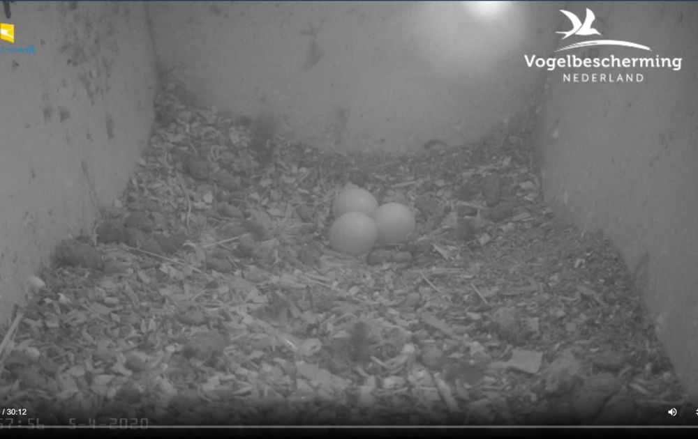 Afgaande op het broedgedrag en de tijd die het vrouwtje afwezig is, heb ik goede hoop op nog een ei. Gisterenavond verliet vrouw - gadegeslagen door velen van ons - rond tien over half negen de eieren en na de traditionele paring verdween ze in het donker. Om iets na eenen kreeg ze op de tak van man een rupsje aangereikt, waarop ze besloot toch maar weer op de eieren te gaan zitten. Veel animo had ze nog niet blijkbaar, want om iets na half twee verdween ze - na een tijd voor het gat te hebben gehangen - opnieuw in de duisternis. Pas een paar minuten voor half zeven nam ze weer plaats op de eieren. In totaal is ze ruim 9 uur van de eieren afgeweest.