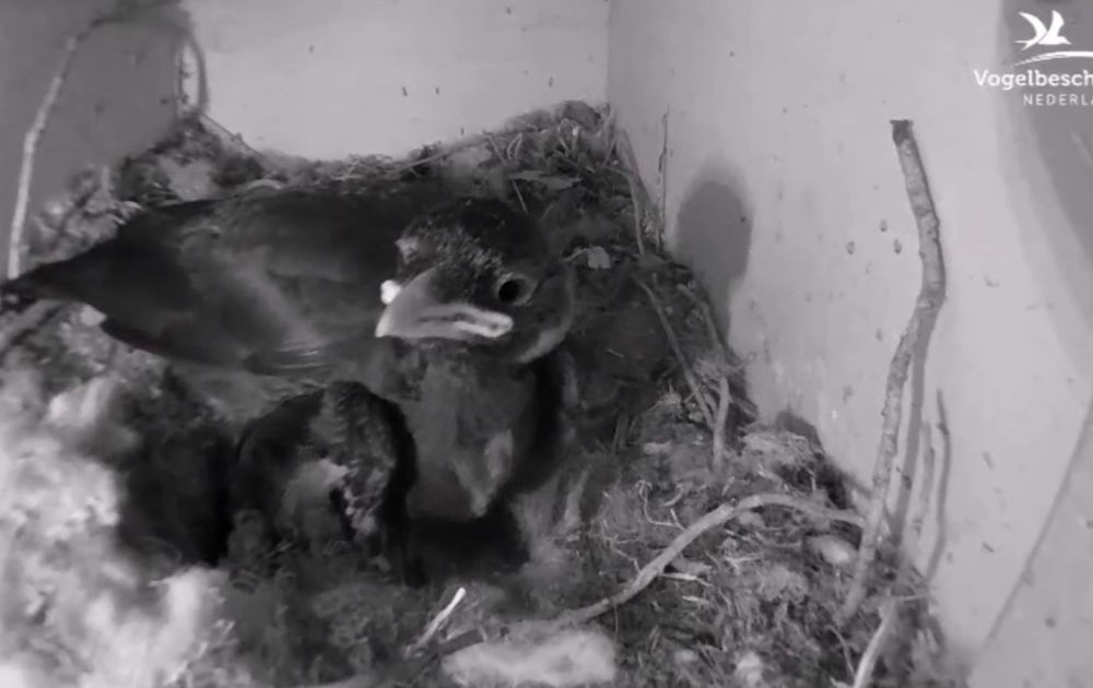 Vanmorgen toen ik de beelden van de Kauw opende, schrok ik toch wel een beetje. Het nest leek leeg. Gelukkig bleek er niets aan de hand te zijn met kuuk, hij was enkel de kast verder aan het verkennen. Op de beelden van de binnencam was de schaduw van kuuk te zien. Hij zit dus netjes bij de deur te wachten op zijn bestelde eten. Ongeduldig? Of zou hij van het mooie weer willen genieten? Ongetwijfeld dat hij het, net als iedereen, warm heeft.