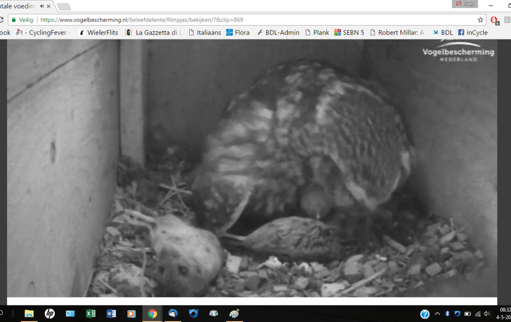 Het mannetje kwijt zich dus prima van dit deel van zijn opdracht. De kast is goed gevuld met lekkere muizen voor het jonge spul. Zijn eerste hoofdtaak heeft hij al eerder volbracht: nageslacht produceren, een kunstje van niks eigenlijk. Zijn tweede, het territorium en de nestplek verdedigen tegen collega-steenuilen en tegen snoodaards die het op de nestkast of de jongen hebben voorzien, tsja, die taak vraagt waarschijnlijk bij tijd en wijlen wat meer energie. Zijn derde hoofdtaak, voldoende voedsel van kwaliteit voor de hongerige jongen bij de nestkast bezorgen, zal hem de komende weken veel inspanningen kosten. Voorlopig nog geen vakantie voor hem, dus.
