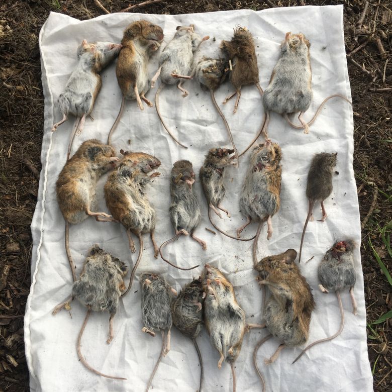 Dat er ook in de rest van ons onderzoeksgebied ruim voldoende muizen zijn, bleek gisteren tijdens onze derde velddag. Bij elkaar troffen we al 73 bosmuizen, 33 veldmuizen en 11 rosse woelmuizen. De kroon werd gespannen door een nest in Lievelde waar de 5 jongen nog 27 muizen onder elkaar te verdelen hadden. Daarvan 20 bosmuizen. Ik heb ze even apart op de foto gezet. Als u denkt ik tel er maar 18, dan klopt dat, 2 wisten er te ontsnappen. Ook hier geldt: even inzoomen voor het beste resultaat.
