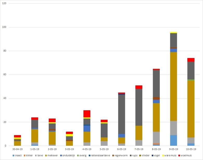 Gelukkig hoefden ze het niet alleen met meikevers te doen: 7 ware muizen en 25 woelmuizen legden een stevige basis. Dat betekent toch bijna 3 muizen per dag. Opvallend is dat het vooral woelmuizen waren, die met de korte staartjes. Dat heeft ongetwijfeld met de terreinomstandigheden te maken. In de weilanden rondom het nest zijn nu een keer meer woelmuizen te vinden dan bosmuizen. Deze houden meer van struikgewas en andere hoger opgaande begroeiingen. In de figuur hierboven ziet u hoe de prooiaanvoer er van dag tot dag precies uitzag. Even inzoomen voor het beste resultaat.