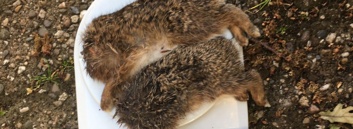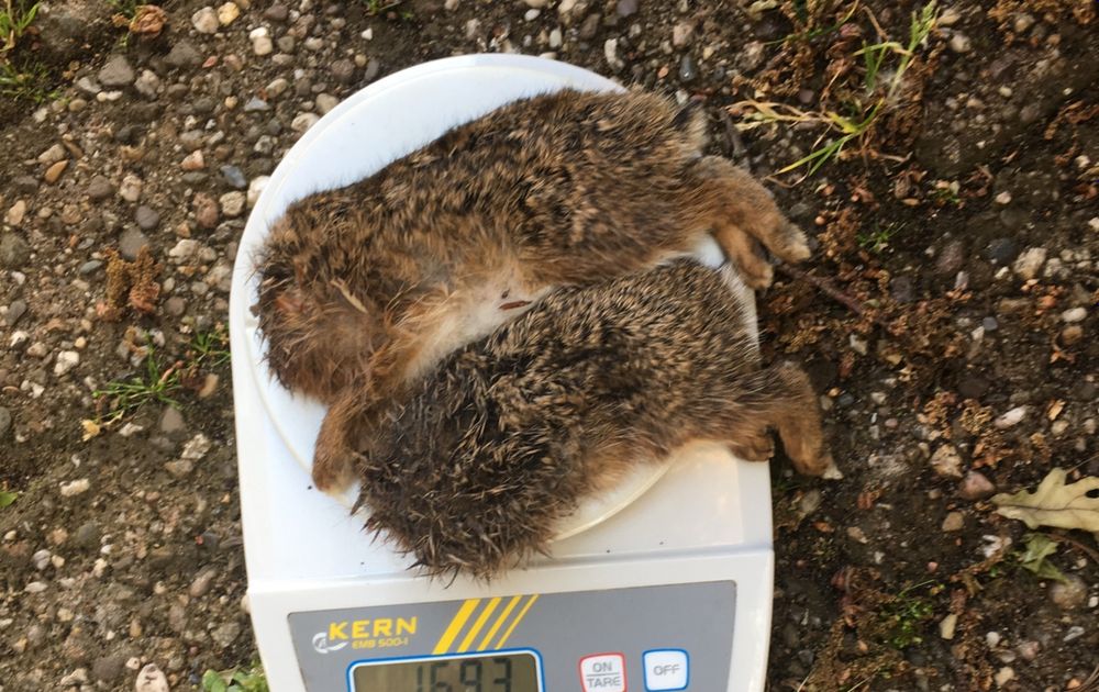 Voor steenuilen is het vangen van een haas, ook al is het dan een jong exemplaar, een huzarenstukje. Of de jonge haasjes in topconditie waren toen ze gevangen werden, weten we niet. Mogelijk betrof het zieke exemplaren die er niet meer als een haas vandoor konden. Wat de steenuilen wel op eigen kracht gedaan hebben, is de haasjes de kast in sleuren. Mogelijk zijn de koppen er beneden al afgebeten – scheelt al gauw enkele tientallen grammen, maar de zwaarste van het tweetal woog zonder kop nog 89,5 gram. De helft van het gewicht van een mannetje steenuil. Wat een toer moet dan geweest zijn! Bij elkaar lag er een voorraad van 167 gram haasbiefstuk op de jongen te wachten. Bijna net zoveel als alle 189 meikevers uit de prooiaanvoer in de eerste 11 dagen. Kwestie van investeren in kwantiteit of kwaliteit.