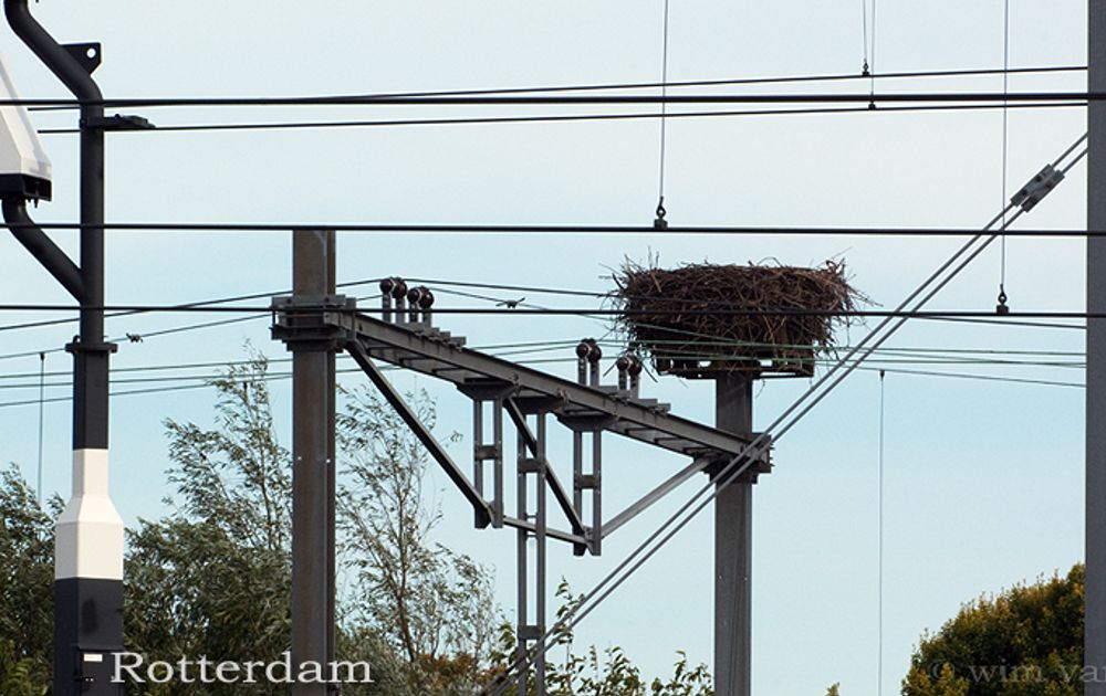 Of op de portalen van de spoorwegen. Daaraan zitten wat meer houvast-mogelijkheden voor de klussende ooievaars. Geen mens mag zich bij de portalen wagen en die voorbij denderende trein, dat is geen probleem … voor de ooievaars.