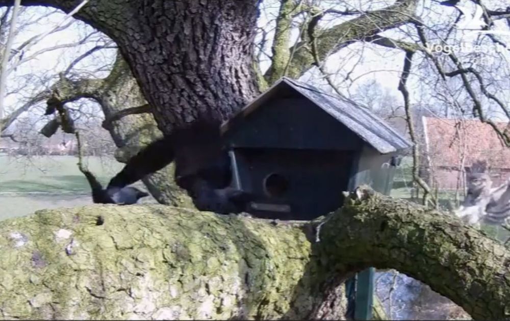 Geschikte holen zijn schaars en nestkasten vormen een aantrekkelijk alternatief. Dat leidt bij tijd en wijle tot stevig onderling gekrakeel en wapengekletter. We hebben dat de afgelopen Beleef de Lentejaren vaak kunnen waarnemen en ook dit jaar vliegen ze elkaar met enige regelmaat weer in de veren. Op de locatie in Harreveld waren het vooral de holenduiven die voor beroering zorgden. Dat ging er soms zo stevig aan toe dat de veren in het rond vlogen en het mannetje de kast bijna niet meer in durfde. In Winterswijk zijn het vooral kauwen die hun zinnen gezet hebben op de nestkast.