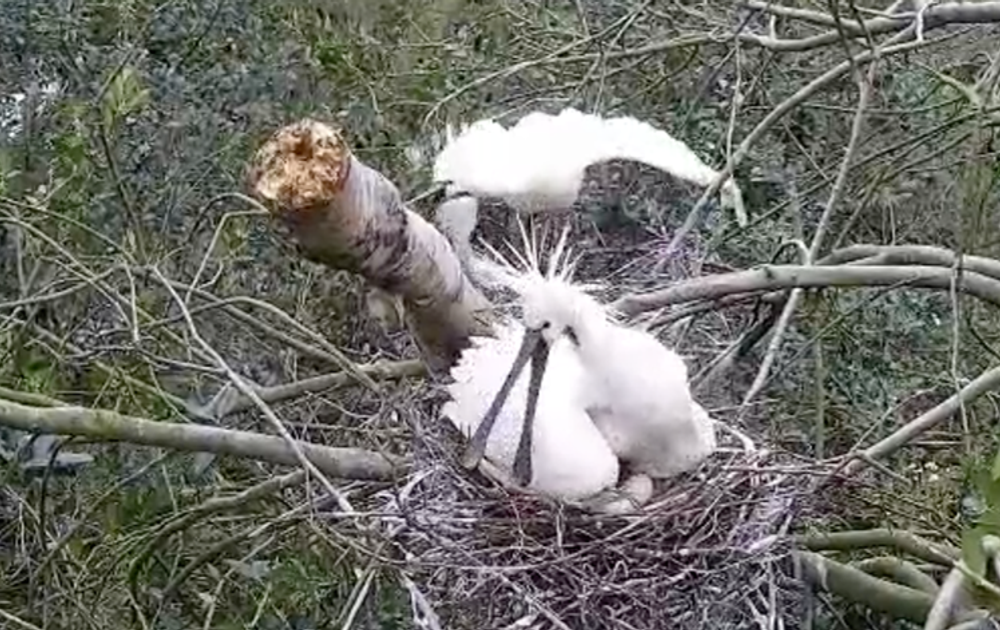 Zaterdagochtend wordt het nest scherper dan ooit in de gaten gehouden. De ene lepelaarclubhuisbezoeker meent nog drie eieren te zien, de ander slechts twee. Feit is dat ik nog geen enkele keer iets heb kunnen ontdekken wat op (oog)contact tussen ouder en jong leek. Laat staan dat de ouder ‘voerbewegingen’ maakte.