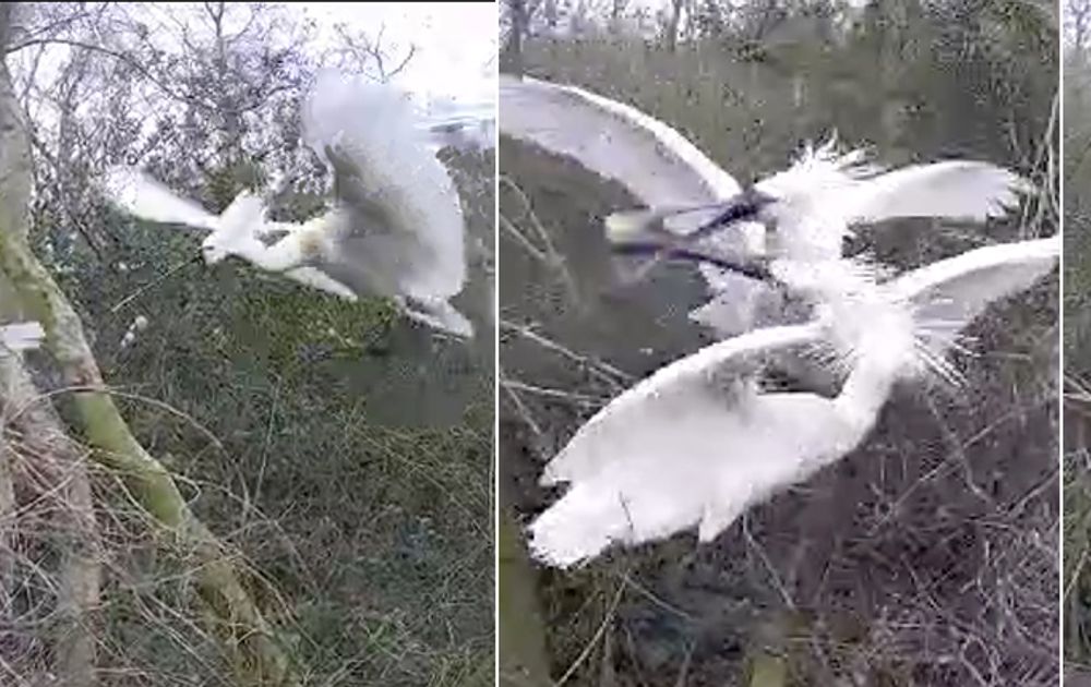 Intussen zien we de lepelaars mogelijke nestplekken inspecteren, daadwerkelijk nesten bouwen, knijpbeestspeelgoedgeluidjes maken, baltsen, paren, lepelbekvechten en zagen we zelfs een koppel met nest en al door het takkenwerk heen kukelen. Gaan die laatste vogels een nieuw nest bouwen? We zullen het allemaal beter dan ooit zien; camera 2 is een stukje op het nest ingezoomd voor nóg mooiere beelden. En hopelijk gaat dat te zijner tijd met camera 1 ook gebeuren.