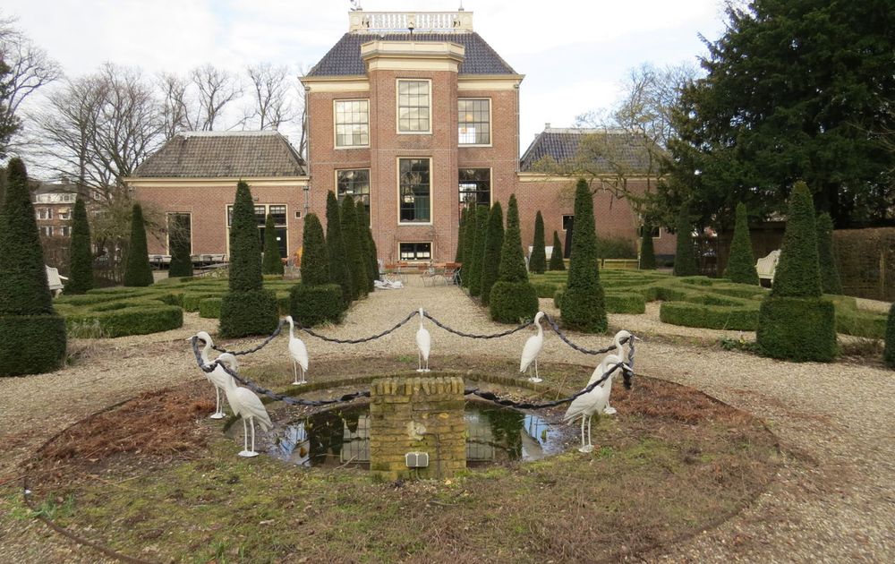 Bij de herinrichting van het park in de jaren 1998-2000 werden uitgebreide waterpartijen uitgegraven en werd de tuin achter huize Frankendael verfraaid met ornamenten. Bankjes met leuningen in de vorm van zwanen in oude stijl deden de historie van deze plaats herleven. Ook het feit dat park Frankendael de oudste reigerkolonie van Amsterdam huisvest (zie eerste blog) werd eer aan gedaan. Dat blijkt wel uit het metalen koord rond de vijver achter het landhuis dat door zeven snavels van beelden van reigers op zijn plaats wordt gehouden (zie bijgaande foto).