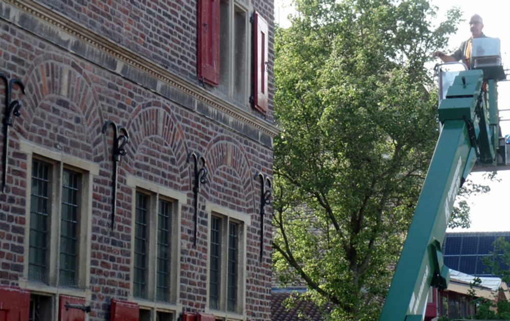 Corona regels 1,5 meter afstand dat snappen en doen we inmiddels allemaal al wel en zit er al helemaal in. Maar als je dan in overleg gaat met de Gemeente Gennep en de Hoogwerker, dan heb je al een probleem. Nou niet met de Gemeente hoor en ook niet met Arie Arts van de hoogwerker, nee die werken en denken beiden volop mee volop mee. Maar met twee in een bakje in de hoogwerker, waar je zeker niet op 1,5 meter van elkaar kan, dat kan natuurlijk niet hé. Nou Leo zegt Arie, dat is niet zo moeilijk, dan doe je dat toch gewoon zelf. Je hebt al vaak genoeg in dat bakje gezeten en weet zelf hoe het werkt en ik kan hem desnoods beneden ook besturen. Dus het probleem op afstand met de hoogwerker is opgelost.