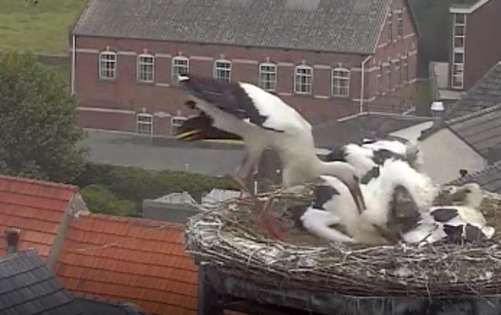 Foto Leo: Screenshot met vreemde (niet geringde) ooievaar in de aanval, deze hakt in op een van de kuikens.