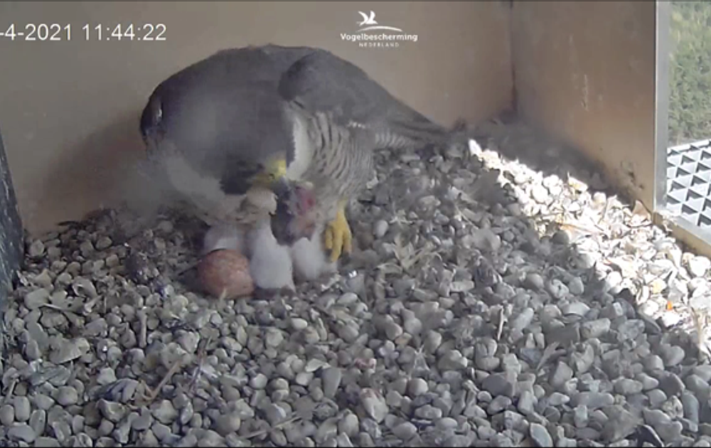 De kuikens hebben 24 uur per dag een reuzehonger en dat laten ze ook luidkeels weten. Niks mis met de stembanden van deze slechtvalkkuikens. In het ei hadden ze de voorraadkast immers ook 24 uur per dag tot hun beschikking. In de eerste dagen verdubbelt hun gewicht van 40 gram naar 80 gram. En dat gaat niet vanzelf. Ze willen eten, eten en nog meer eten. Ze worden om de 90 tot 120 minuten gevoed.