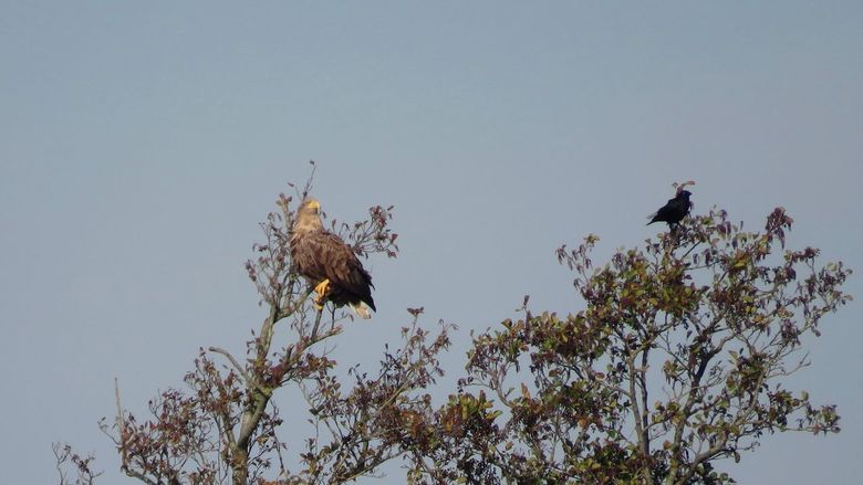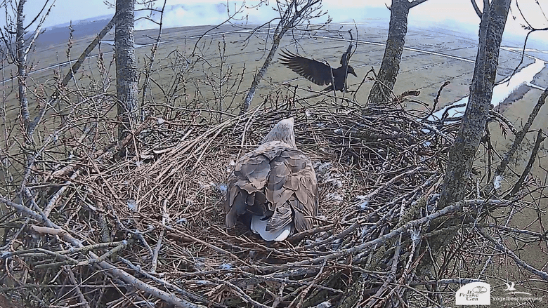We zien dat de zeearenden zeer alert blijven en zo nodig met luidruchtige agressie reageren op de zwarte kraaien.