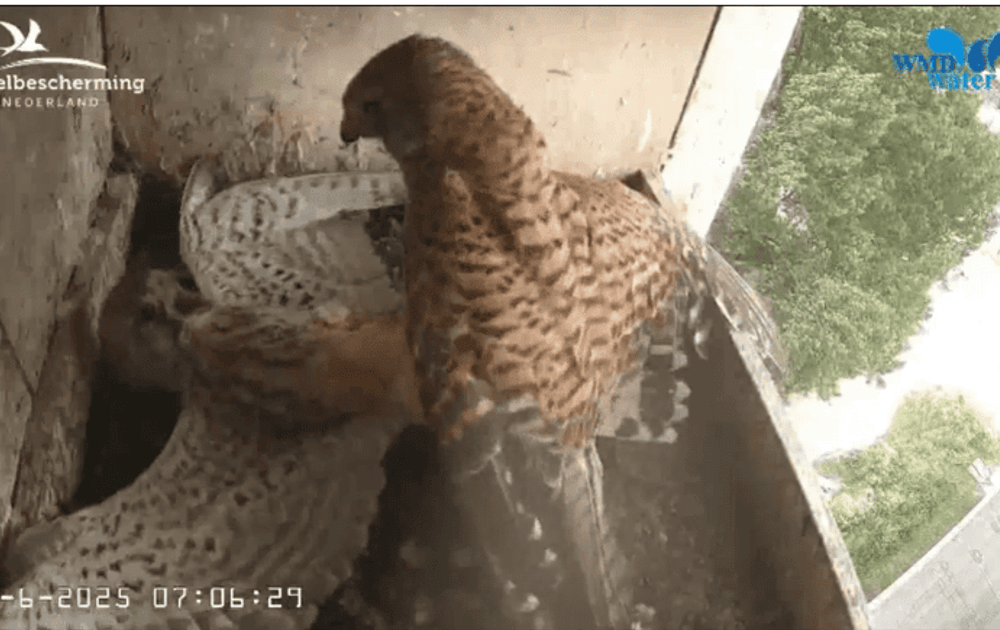 Na het uitvliegen van de jongen, keren ze nog geregeld terug naar de nestkast in de watertoren. Daardoor krijgen we ook gedrag te zien, dat anders buiten ons gezichtsveld blijft. Zo hebben we de afgelopen dagen meerdere keren getuige kunnen zijn van onderlinge ruzies.