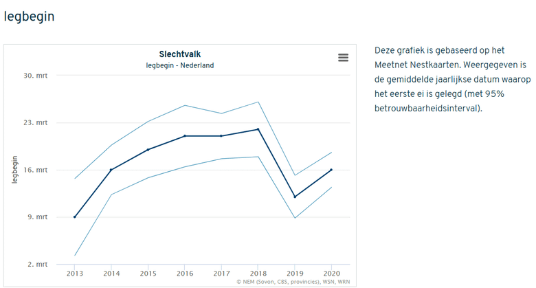 Tip: in onderstaande grafiek van Sovon zie je wat het gemiddelde jaarlijkse legbegin is van slechtvalken in Nederland.