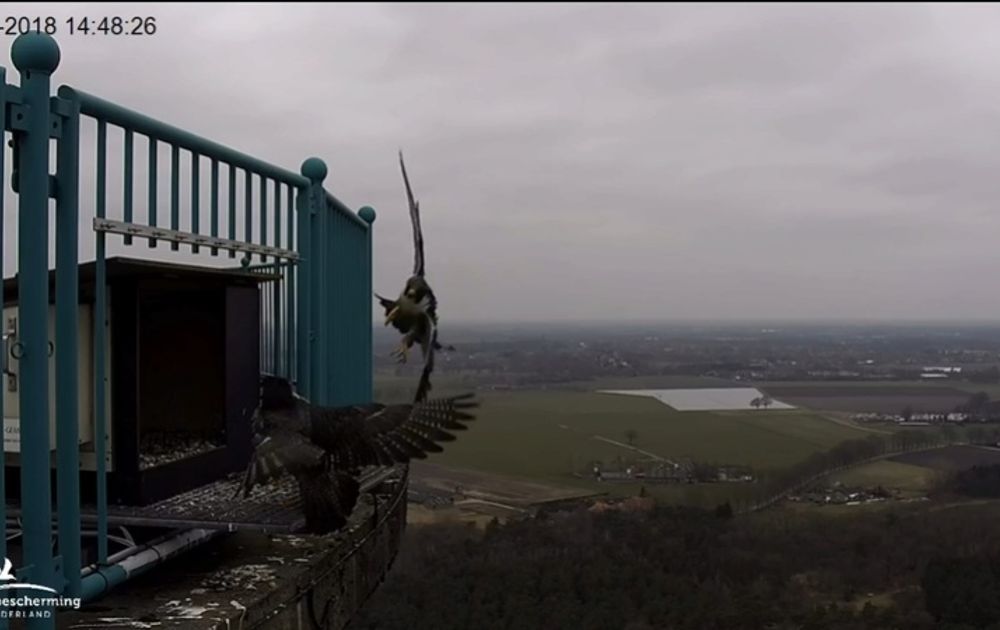NV heeft net als de meeste onder ons nu ook weekend en geniet redelijk ongestoord van haar welverdiende nachtrust en zo te zien heeft ze geen last van nachtmerries over hetgeen gisteren heeft plaatsgevonden. Het kersverse setje heeft zich vandaag niet al te veel laten zien. Onze reporter ter plaatse (kuiko) melde ons dat beide SV’s achter een groep van 50 duiven aanzaten en dat beiden pogingen deden er eentje te verschalken. Of het daadwerkelijk gelukt is zal altijd een vraag blijven. Qua paringen was het een productieve dag. We konden er 9 noteren die in beeld waren, maar uit hun lange afwezigheid mag geconcludeerd worden dat ze in de dubbele cijfers gaan eindigen. Een ware prestatie en laten we maar zeggen dat het nieuwe paar goed op dreef is. Zolang ze paren is de kans zeer reëel dat, ijs en weder dienende, er voor de volgers en het stel positief vervolg komt. De zon schijnt vandaag, de temperatuur wordt steeds aangenamer en terwijl ik dit schrijf hoor ik de vogels vanuit de open achterdeur druk bezig zijn. Spring is comming! M en NV hebben ook weer hele gesprekken vandaag in de kast, helaas doet het geluid het nog niet, maar hier wordt wel keihard aan gewerkt. Alles is rustig…. wacht.. om 17.00 zijn er weer aanvallen. Deze blijven gelukkig beperkt en de aanvaller is waarschijnlijk een juveniel. Dat is een nog niet-geslachtsrijpe slechtvalk met praatjes. De avond valt en een valk komt op het rooster. Is het NV of M. In de chat is er twijfel, maar hier oogjes dicht en snaveltje toe.. Toedeloe