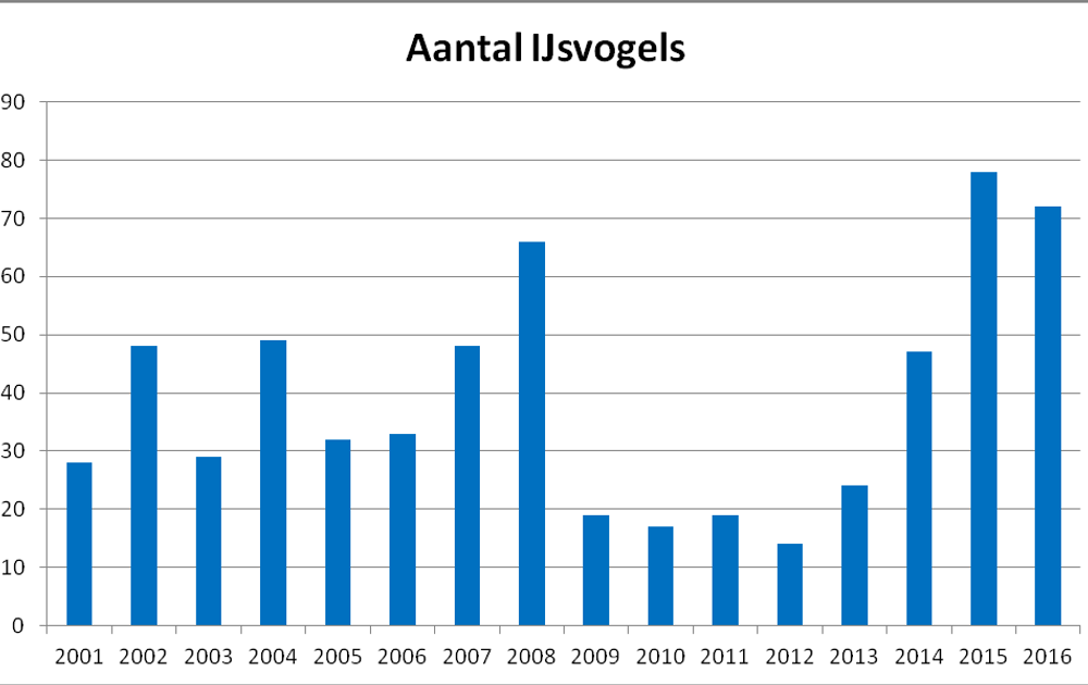 In 2016 zijn 72 territoria gevonden, het op één na hoogste aantal ooit. Alleen in 2015 werd een groter aantal IJsvogels vastgesteld, namelijk 78. Het derde topjaar was 2008 met 68 territoria! Waarschijnlijk was 2001 ook een heel goed jaar, maar toen konden als gevolg van de MKZ-crisis veel beken niet worden bezocht.