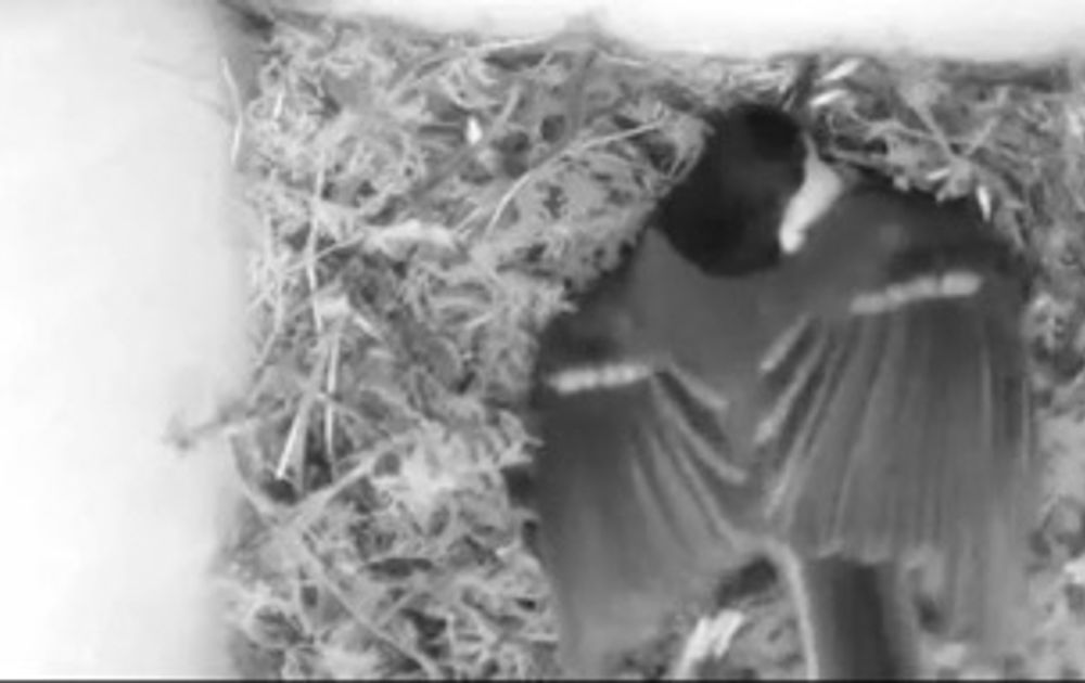 Een ander heel goed teken is de interactie tussen man en vrouw. In dit clipje zien we hoe de vrouw in de nestkast gaat en vervolgens begint te bedelen om voedsel. Dit is te herkennen aan de hoge geluidjes die ze maakt en het trillen van haar vleugels. Hiermee probeert ze de man te verleiden haar een lekker hapje te geven. De man hangt vervolgens aan de nestkastopening met een prooi in zijn snavel, de vrouw opent haar snavel ennnnn…. hij eet de prooi zelf op… Oké, nog even oefenen dus. Als je vrouw daadwerkelijk aan het broeden is zul je haar toch echt van voedsel moeten voorzien, koolmeesman! Maar het feit dat de koolmezen al aan het “oefenen” zijn is een fantastisch teken.