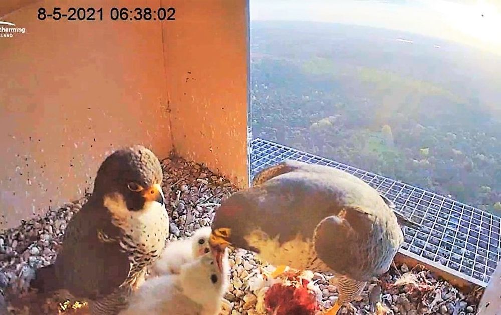 Binnen 44 uur kwamen de twee kuikens uit het ei. Op 21 en 23 april. Na 33 dagen broeden. We waren getuige van het teamwork van de ouders. Het mannetje wil graag helpen met voeren. Samen versnipperen ze steeds heel kleine stukjes vlees met de snavels.