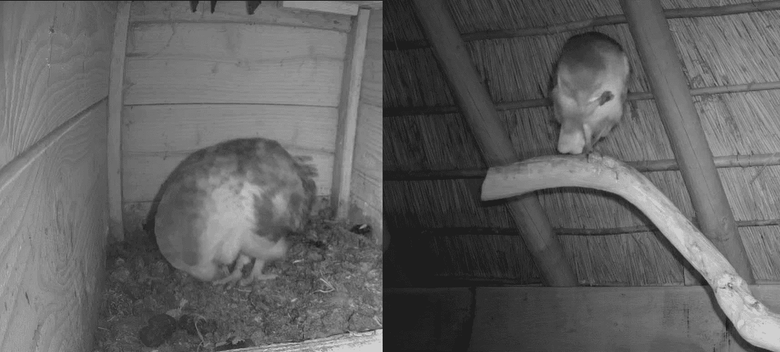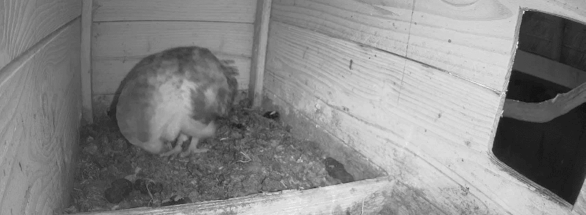 De tweede functie van de baltsroep van man is het afbakenen van zijn territorium. Daarmee wil hij dus zeggen ‘deze plek is bezet, geen andere kerkuilen welkom!’. De baltsroep is dan ook luid en duidelijk op honderden meters afstand hoorbaar. Eventuele indringers die het tóch wagen om het territorium te betreden, worden luidruchtig verdreven. We hebben dit jaar nog geen indringers op de camera gezien, maar er wonen zeker meer kerkuilen in de buurt. Het zou dus zomaar kunnen dat we nog ongenode gasten voorbij gaan zien komen. De ervaring leert dat onze uilen eventuele indringers prima kunnen verdrijven; deze prachtige plek is immers niet om zomaar af te staan!