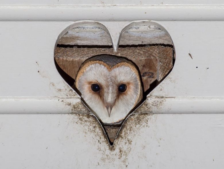 Zoals ons koppel bewijst, is het op dit moment een prima tijd om de baltsroep van de kerkuil te horen. Man kerkuil zegt met zijn roep eigenlijk twee verschillende dingen. Ten eerste probeert hij natuurlijk vrouw kerkuil het hof te maken. Vrouw lijkt zich daar niet altijd iets van aan te trekken. Het is een grappige aanblik als man kerkuil in de kast minutenlang de longen uit zijn lijf schreeuwt en vrouw kerkuil intussen stoïcijns op de tak buiten de kast zit te poetsen alsof ze niks hoort. Maar regelmatig gaat ze toch overstag en volgt er een paring. Met de band tussen de twee zit het wel goed.