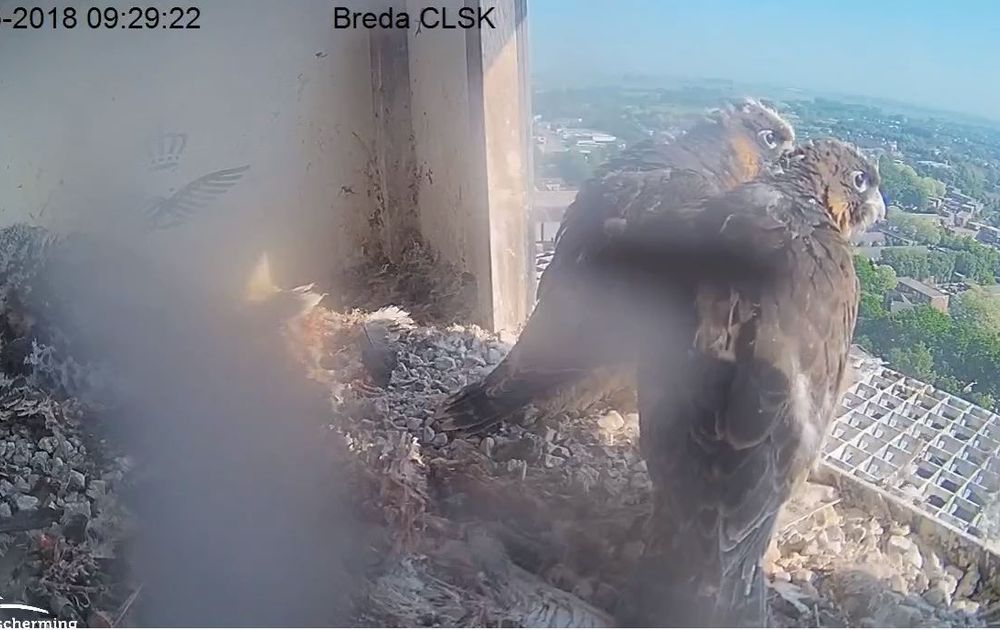 De slechtvalken op de Luchtmachttoren in Breda zijn 21 mei begonnen aan de eerste wandelingen buiten over de reling. Het zijn de beide jonge mannetjes EAE en ERT die het eerst naar buiten zijn gegaan en overdag ook grotendeels buiten slapen en gevoerd worden door de ouders. 's Avonds en 's nachts blijven ze voorlopig nog wel in de kast. Buiten het beeld van de camera oefenen ze het vliegen, door hun vleugels wijd uit te spreiden en de wind daar doorheen te laten waaien. Over een paar dagen zullen de eerste vluchten gemaakt gaan worden en hopen we ze niet beneden op de grond aan te treffen zoals in 2017.