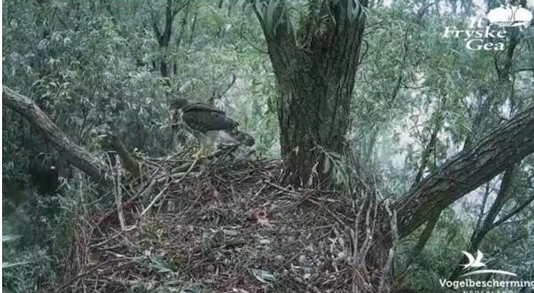 Zo weinig dat de beide ouders bij het jong in het nest aanwezig waren, zo vaak zijn ze er nu. Gisterochtend was het mannetje vaak aanwezig en heeft een deel van de restprooien zelf opgegeten. Tegen de avond zat het vrouwtje een hele poos op het nest, ze pakte de kans om ook een prooi naar binnen te werken. Het is natuurlijk mooi om de ouders op het nest te zien, maar ja…